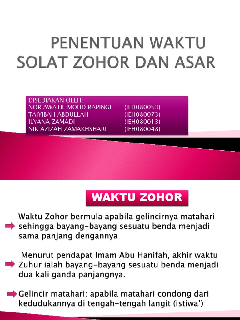 Solat Fardu Zohor صلاة الظهر merupakan salah satu daripada lima 5 solat fardhu yang diwajibkan ke atas umat Islam. Jadual Waktu Solat Zohor Ipoh Waktu ZohorZuhur ظهر bermula daripada gelincir matahari dari kedudukan tengah langit hingga bayang-bayang suatu benda menyamai panjangnya. Jadual Waktu Solat Zohor Bandar Melaka Waktu ZohorZuhur ظهر bermula daripada gelincir matahari dari kedudukan tengah langit.